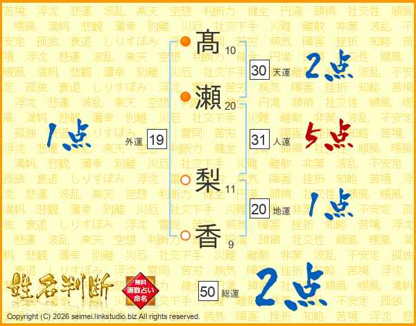 髙(10画)瀬(20画) 梨(11画)香(9画)