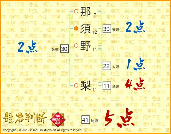 生活面を象徴する運勢です。外部から受ける影響力を表し、結婚運、家庭運や職場、環境への順応性を表します。総運から人運を引いた画数。姓や名が1文字の場合を除く。