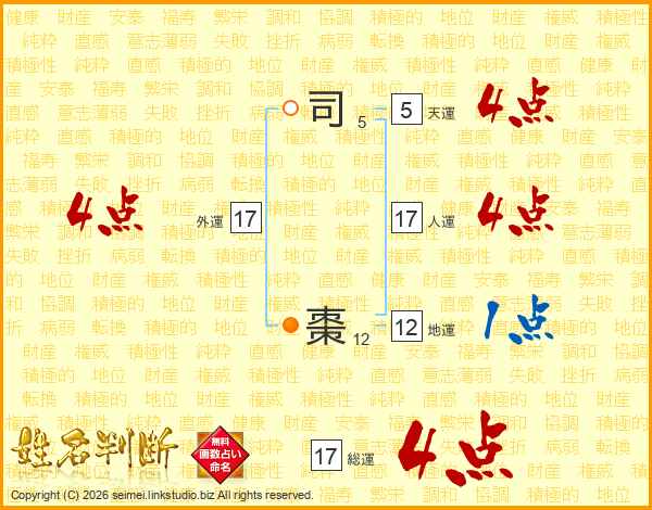 生活面を象徴する運勢です。外部から受ける影響力を表し、結婚運、家庭運や職場、環境への順応性を表します。総運から人運を引いた画数。姓や名が1文字の場合を除く。