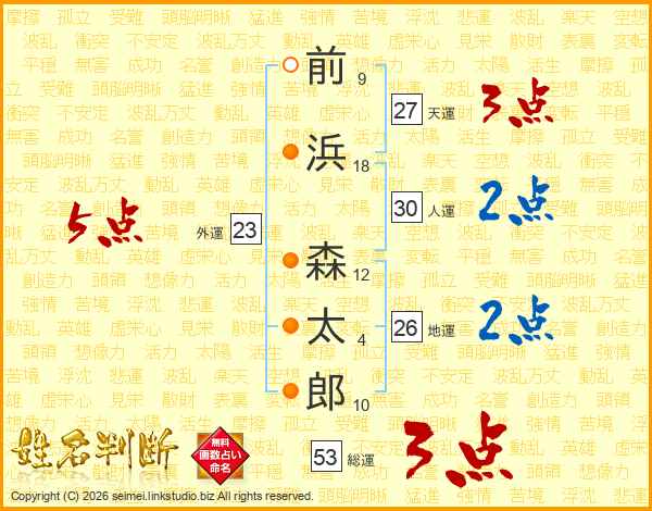 前(9画)浜(18画) 森(12画)太(4画)郎(10画)