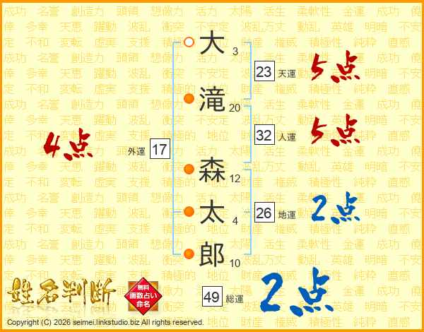 大(3画)滝(20画) 森(12画)太(4画)郎(10画)