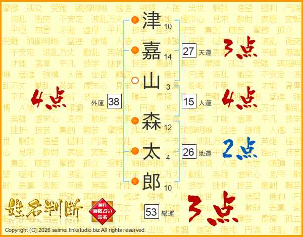 津(10画)嘉(14画)山(3画) 森(12画)太(4画)郎(10画)