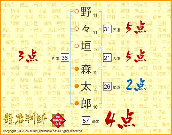 野々垣森太郎さんの総運は57画の4点!