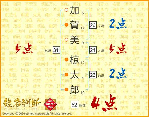 加(5画)賀(12画)美(9画) 椋(12画)太(4画)郎(10画)