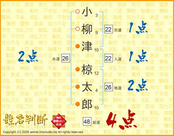 小(3画)柳(9画)津(10画) 椋(12画)太(4画)郎(10画)