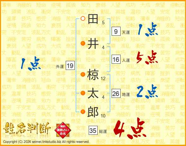 田(5画)井(4画) 椋(12画)太(4画)郎(10画)