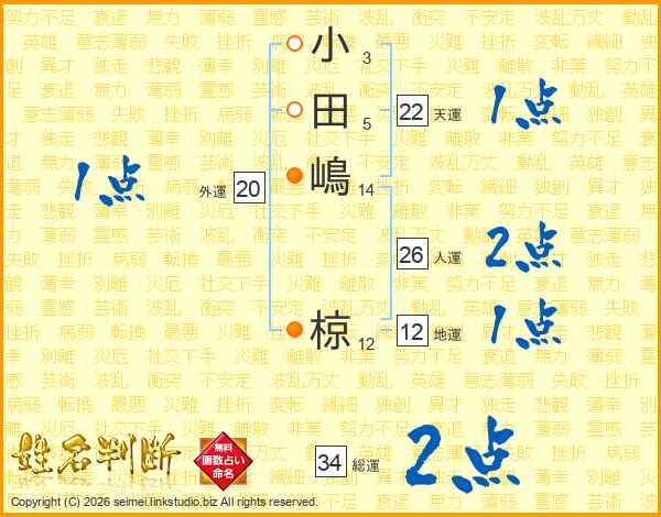 小(3画)田(5画)嶋(14画) 椋(12画)