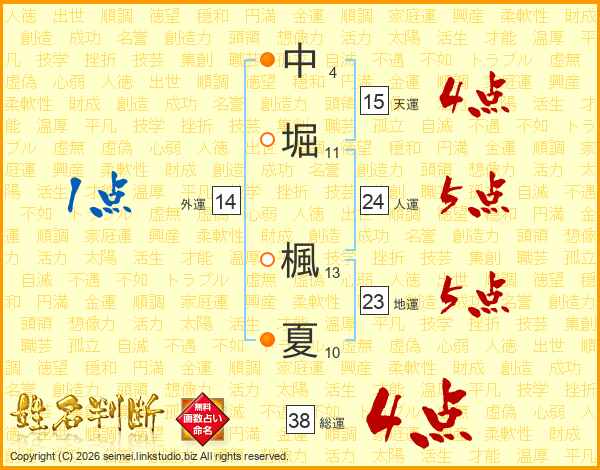 中堀楓夏さんの総運は38画の4点!