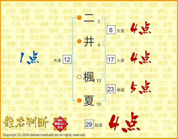 二井楓夏さんの総運は29画の4点!