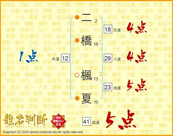 二橋楓夏さんの総運は41画の5点!