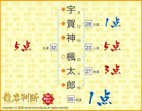 宇(6画)賀(12画)神(10画) 楓(13画)太(4画)郎(10画)