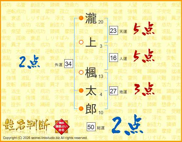 瀧上楓太郎さんの天運は23画の5点!