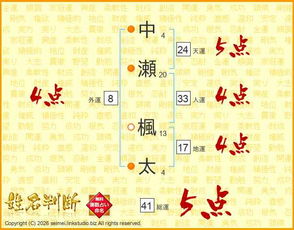 中(4画)瀬(20画) 楓(13画)太(4画)