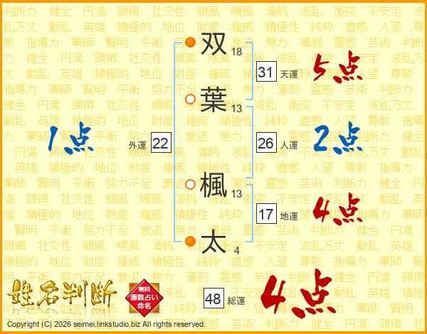 双(18画)葉(13画) 楓(13画)太(4画)