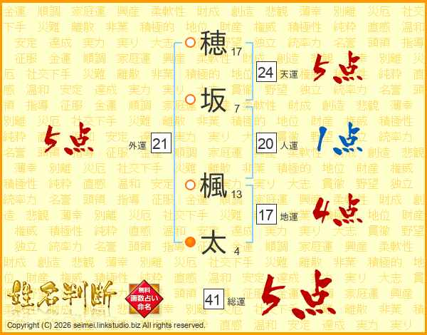 穂(17画)坂(7画) 楓(13画)太(4画)
