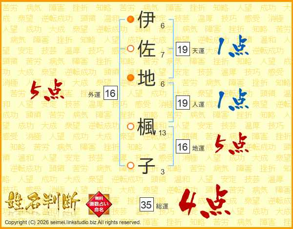 伊(6画)佐(7画)地(6画) 楓(13画)子(3画)