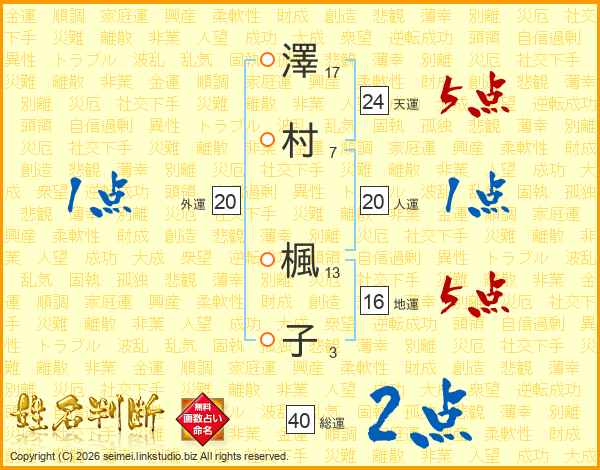 澤(17画)村(7画) 楓(13画)子(3画)