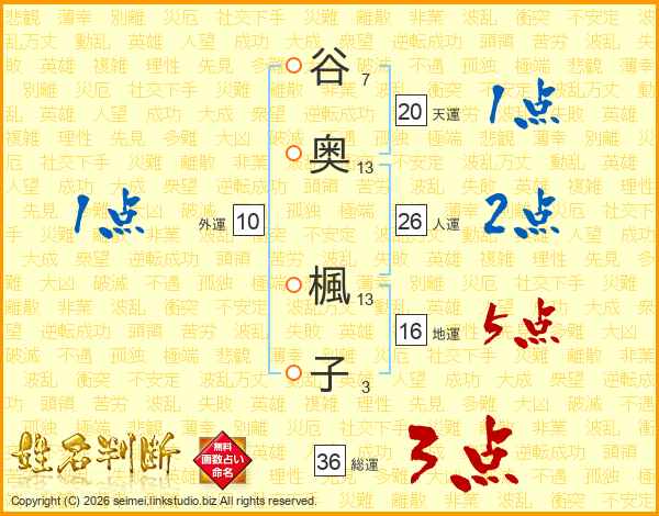 谷(7画)奥(13画) 楓(13画)子(3画)
