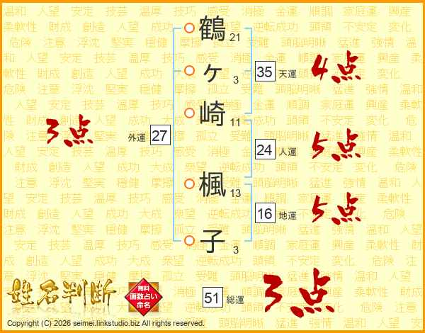 鶴ヶ崎楓子さんの総運は51画の3点!