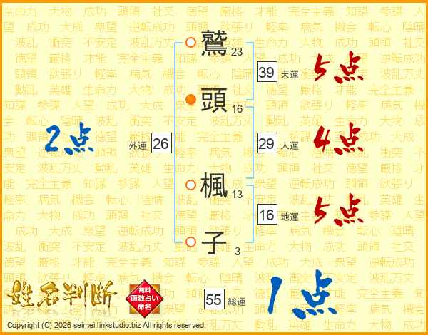 鷲(23画)頭(16画) 楓(13画)子(3画)