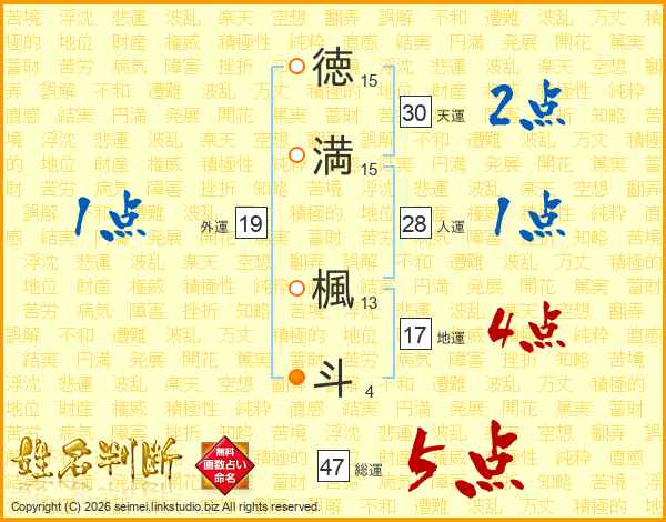 徳(15画)満(15画) 楓(13画)斗(4画)