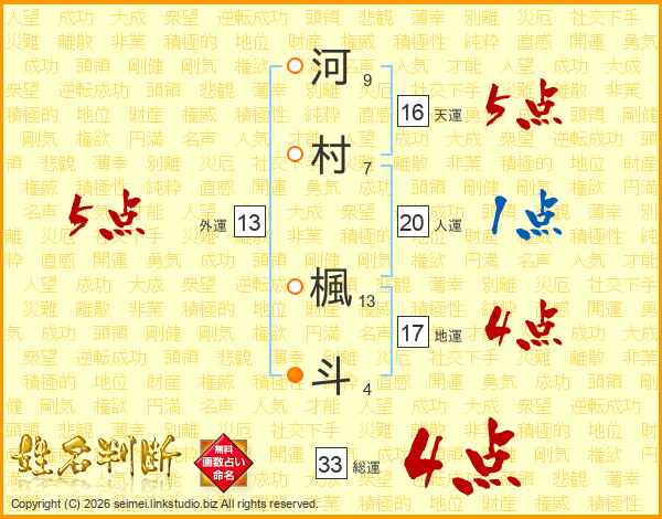 生活面を象徴する運勢です。外部から受ける影響力を表し、結婚運、家庭運や職場、環境への順応性を表します。総運から人運を引いた画数。姓や名が1文字の場合を除く。