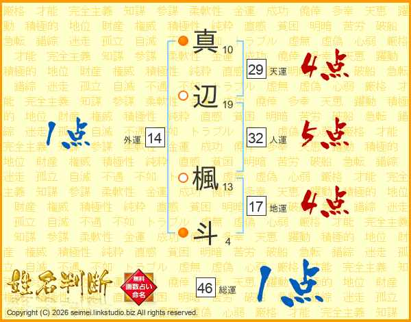 真(10画)辺(19画) 楓(13画)斗(4画)