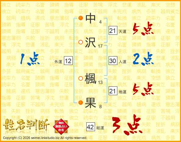 生活面を象徴する運勢です。外部から受ける影響力を表し、結婚運、家庭運や職場、環境への順応性を表します。総運から人運を引いた画数。姓や名が1文字の場合を除く。