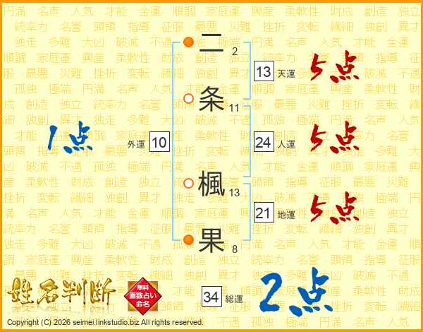 生活面を象徴する運勢です。外部から受ける影響力を表し、結婚運、家庭運や職場、環境への順応性を表します。総運から人運を引いた画数。姓や名が1文字の場合を除く。