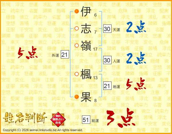 伊(6画)志(7画)嶺(17画) 楓(13画)果(8画)