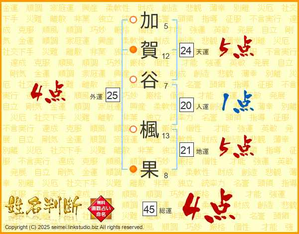 加(5画)賀(12画)谷(7画) 楓(13画)果(8画)