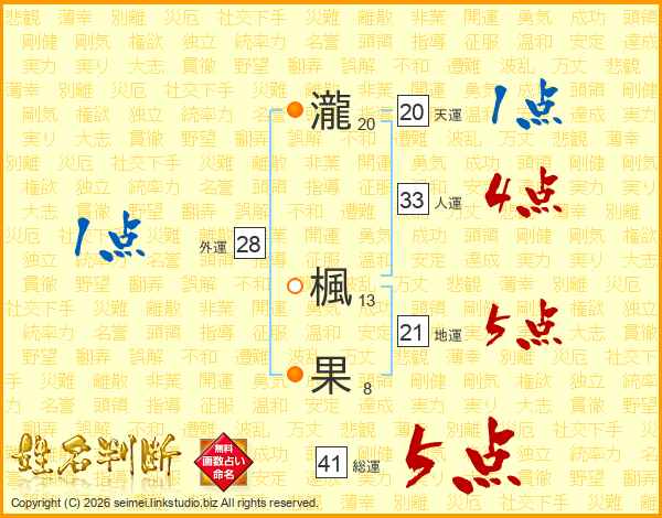 生活面を象徴する運勢です。外部から受ける影響力を表し、結婚運、家庭運や職場、環境への順応性を表します。総運から人運を引いた画数。姓や名が1文字の場合を除く。