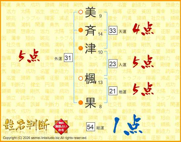 美(9画)斉(14画)津(10画) 楓(13画)果(8画)
