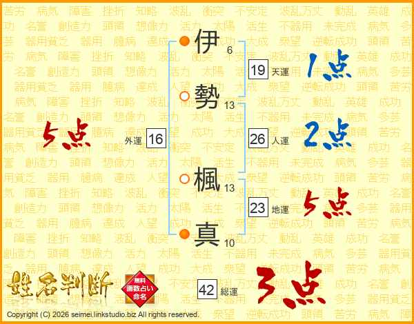伊(6画)勢(13画) 楓(13画)真(10画)