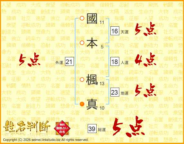 國本楓真さんの総運は39画の5点!