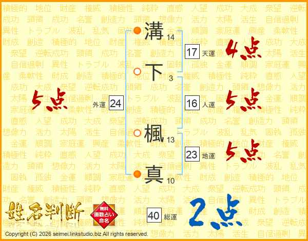 生活面を象徴する運勢です。外部から受ける影響力を表し、結婚運、家庭運や職場、環境への順応性を表します。総運から人運を引いた画数。姓や名が1文字の場合を除く。