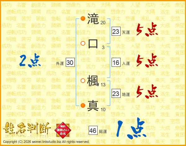 滝(20画)口(3画) 楓(13画)真(10画)