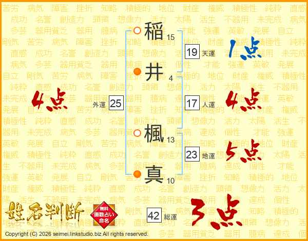 稲(15画)井(4画) 楓(13画)真(10画)