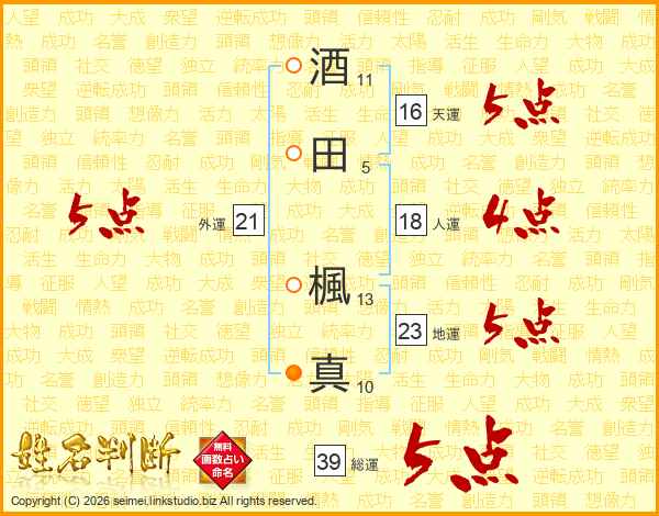 酒田楓真さんの総運は39画の5点!