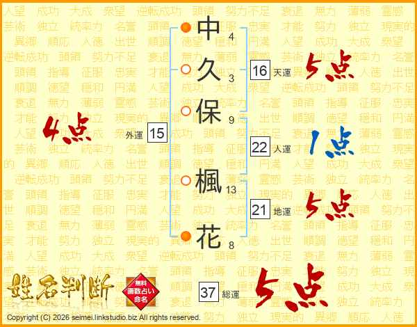 中久保楓花さんの総運は37画の5点!