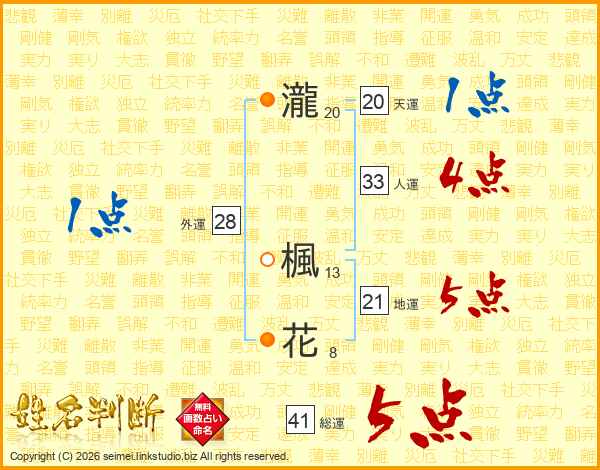 生活面を象徴する運勢です。外部から受ける影響力を表し、結婚運、家庭運や職場、環境への順応性を表します。総運から人運を引いた画数。姓や名が1文字の場合を除く。