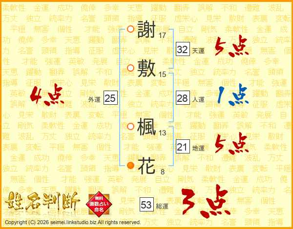 謝敷楓花さんの総運は53画の3点!