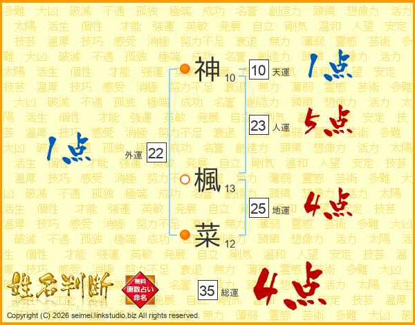 生活面を象徴する運勢です。外部から受ける影響力を表し、結婚運、家庭運や職場、環境への順応性を表します。総運から人運を引いた画数。姓や名が1文字の場合を除く。