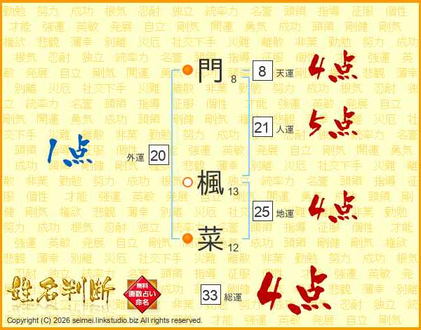 門楓菜さんの総運は33画の4点!