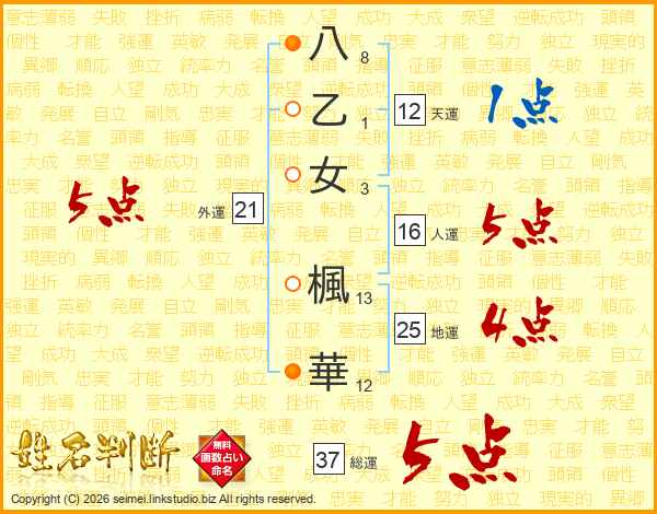 八(8画)乙(1画)女(3画) 楓(13画)華(12画)