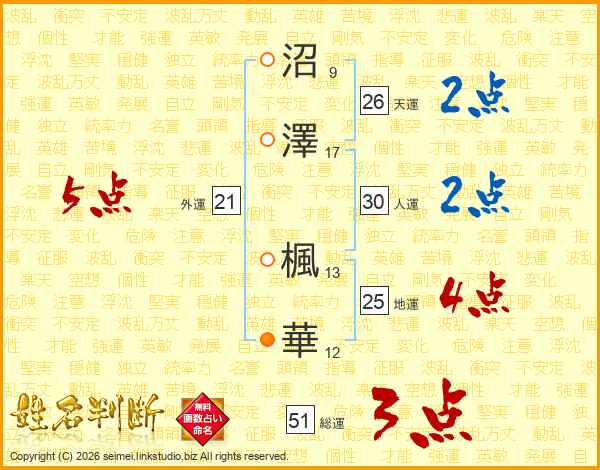 沼(9画)澤(17画) 楓(13画)華(12画)