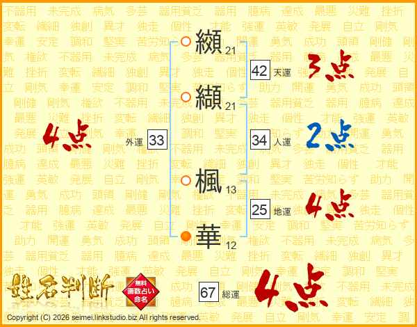 纐纈楓華さんの総運は67画の4点!