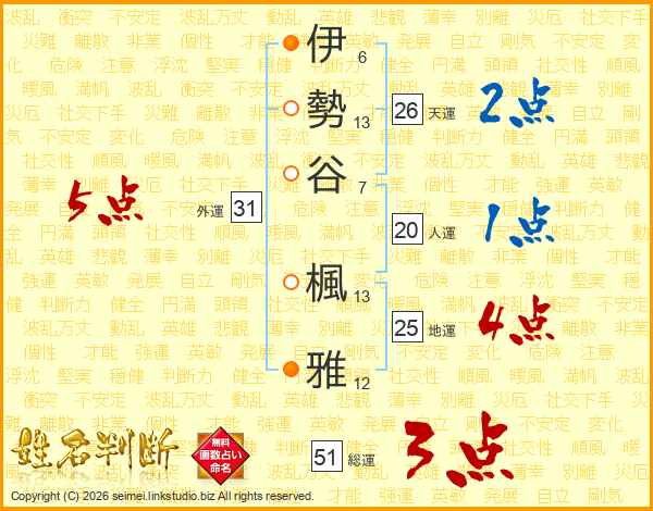 伊(6画)勢(13画)谷(7画) 楓(13画)雅(12画)