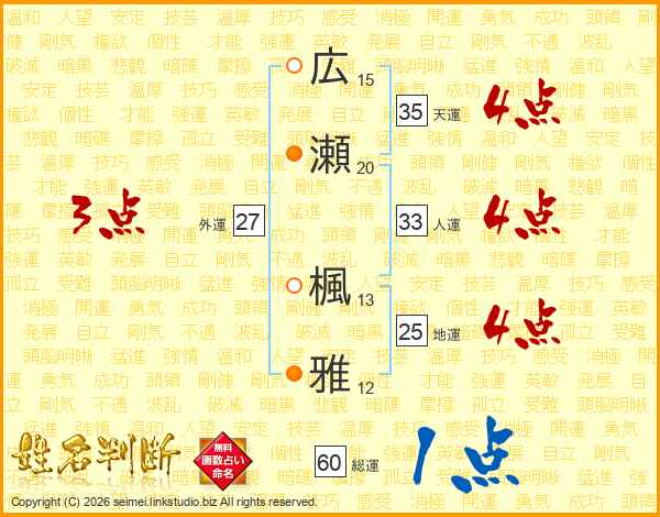 広瀬楓雅さんの人運は33画の4点!
