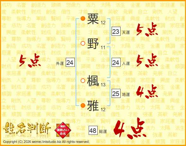 粟(12画)野(11画) 楓(13画)雅(12画)